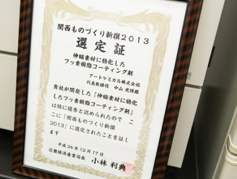 アートケミカルの新しいフッ素樹脂コーティングの技術が認められ、近畿経済産業局認定「関西ものづくり新撰2013」にて新市場創出分野の承認を受けました。
